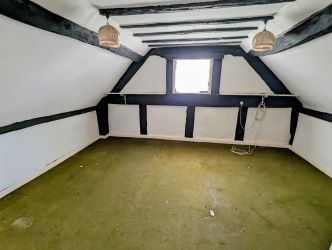 Having small fireplace, night storage heater, window to front, shelving and exposed beams.