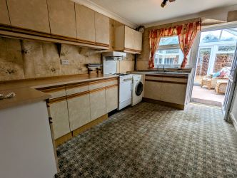 Being of older style having base and eye level units, cooker space, work surface area with stainless steel double drainer sink unit, fridge space, radiator, double glazed window and double glazed door out to -