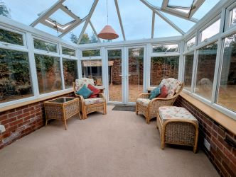 Having a brick base with double glazed windows, double glazed doors and further double glazed single door to outside.