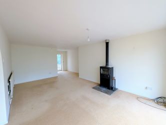 With picture window to front, wood burning stove and door to rear.