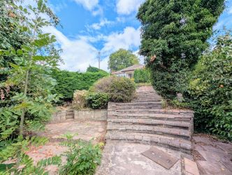 A drive provides parking for a few cars, where there is an area of lawn. The remainder of the garden is paved and enclosed within high screening Conifer hedging with an array of further individual trees with paths giving access to different levels of the garden and a ornamental pond. There is a Double Garage 5.88m x 6.78m and parcel of land next to a small stream.